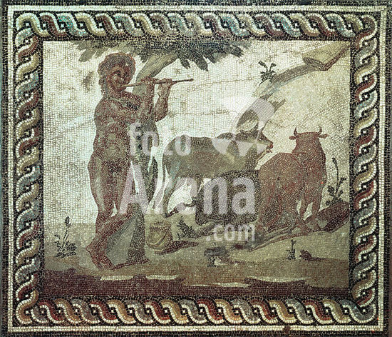 akg3001361 Römisches Mosaik, Griechenland, 1. Jahrhundert n.Chr. Rinderhirte. Fußbodenmosaik. Herkunft: Korinth (Peloponnes, Griechenland). Korinth, Archäologisches Museum. Museum: Korinthos, Archaeological Museum. Author: ANONYMOUS.