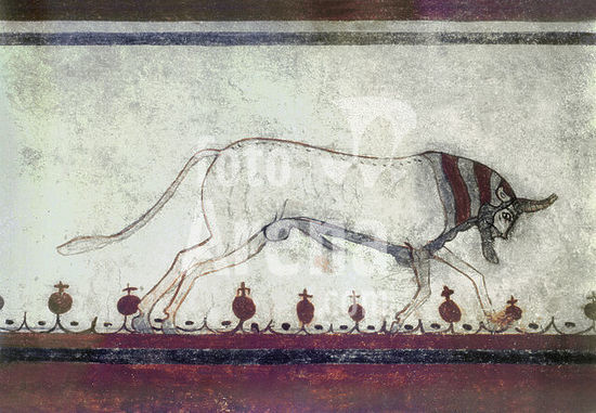 akg3001846 Tarquinia (Latium, Italien), Monterozzi-Nekropole (seit 2004 UNESCO-Welterbe), Tomba dei Tori / Grab der Stiere. /. - Angreifender Stier mit Menschengesicht (Acheloos). - Wandmalerei, etruskisch, um 550/5540 v.Chr. Ausschnitt aus dem Fries mit Stieren und erotischen Gruppen an der Rückwand. Foto, undatiert. Author: ANONYMOUS.