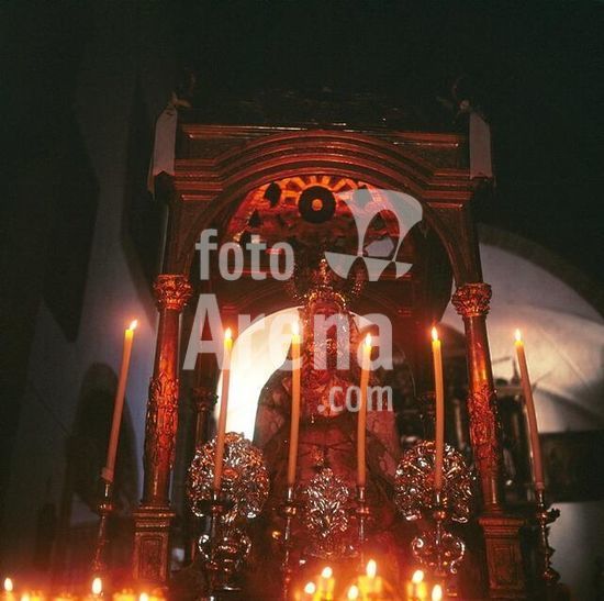 akg3020138 Religion / Kirche / Prozession. In Portugal: Skulptur der Jungfrau Maria (19.Jh.), aufgestellt unter einem Baldachin in einem Kircheninnenraum. - Foto, o.O., August 1974.