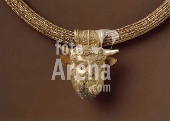 akg332743 Etruscan, Hellenistic period, 3rd cent. BC. Chain with pendant (head of Acheloos). Detail. Gold, length of pendant 3.3 cm. Found at: Praeneste (Palestrina). Form. Barberini Collection. Inv. no. 13206. Rome, Museo Nazionale di Villa Giulia. Museum: Rome, Museo Nazionale di Villa Giulia.