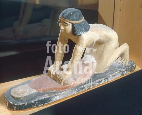 akg339973 Egyptian, Old Kingdom, 5th dynasty, 2450-2290 BC. Kneeling woman grinding corn. Burnt clay, painted. Inv. no. 66118. Florence, Museo Archeologico. Museum: Florence, Museo Archeologico.