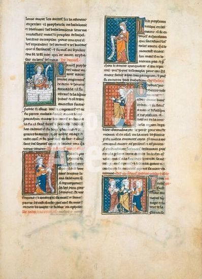akg345582 Illumination, France, ca 1310/20. - Text page with miniatures "porphets Daniel, Achias, Tobias et al." - Illustration for: Brunetto Latini (ca. 1230-1294). Li livres dou Tresor (The Treasure Books). On parchment, 310 × 220 mm. Fr. F. v. III, 4. fol. 18 r, St Petersburg, Russian National Library. Museum: St Petersburg, Russian National Library.