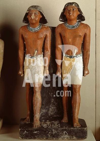 akg362246 Egyptian, Old Kingdom, 5th dynasty, reign of Neuserre or later, c. 2428-2325 BC. Double statue of Nimaatsed, priest of Re and Hathor. Limestone, painted, height 57cm, width 29.5cm, depth 17.5cm. Origin: Saqqara, mastaba D. 56. Inv. no. CG 133. Cairo, Egyptian Museum. Museum: Cairo, Egyptian Museum.