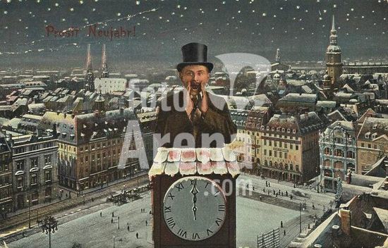 akg3758574 Kalenderfeste / Neujahr (1. Januar). - "Prosit Neujahr!" - (Neujahrsrufer über dem Alten Markt in Dresden). Bildposkarte (Farbdruck nach kolorierter Fotomontage), o. O., undatiert (um 1905). Privatsammlung. Museum: PRIVATE COLLECTION. Author: ANONYMOUS.