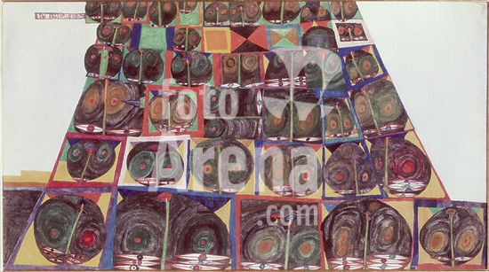 akg3877745 Friedensreich Hundertwasser. 177 LES 39 TETES. 39 HEADS. DIE 39 KÖPFE. St. Mandé/Seine, 1953. Öl auf Kreidegrund auf Leinwand. 540 mm x 960 mm. Painted in St. Mandé/Seine, Castel Dumage, December 1953, in the company of Wochinz. Copyright: Additional copyrights must be cleared. © NAMIDA AG, Glarus / Switzerland.