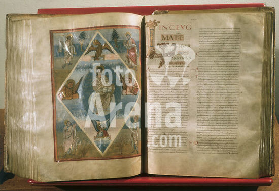 akg3886383 Buchmalerei, karolingisch, Benediktinerabtei Tours, um 840. - Doppelseite, links: Majestas Domini (Thronender Christus mit den vier Evangelistensymbolen), rechts: Incipit-Seite mit Initiale "L" (Liber generationis Iesu Christi / Dies ist das Buch von der Geburt Jesu Christi...; - Beginn des Evangeliums nach Matthäus). - Aus der Bibel aus Moutier-Grandval. Pergamenthandschrift, 449 folios. Blattfomrat 51 x 37,5 cm. Im 16.Jahrhundert im Besitz der Schweizer Abtei Moutier-Grandval. Ms. Additional 10546, folio 325 verso / 326 recto. London, British Library. Museum: London, British Library. Author: ANONYMOUS.