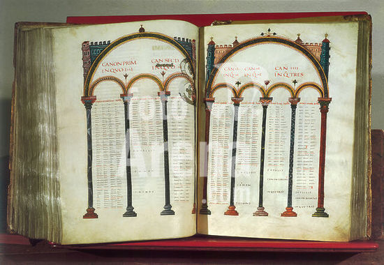 akg3886387 Buchmalerei, karolingisch, Benediktinerabtei Tours, um 840. - Doppelseite mit den Kanontafeln (Konkordanzen der Evangelien nach den Kapitelzahlen, zehn Kanones, von Eusebius von Caesarea). - Aus der Bibel aus Moutier-Grandval. Pergamenthandschrift, 449 folios. Blattfomrat 51 x 37,5 cm. Im 16.Jahrhundert im Besitz der Schweizer Abtei Moutier-Grandval. Ms. Additional 10546, folio 349 verso / folio 350 recto. London, British Library. Museum: London, British Library. Author: ANONYMOUS.