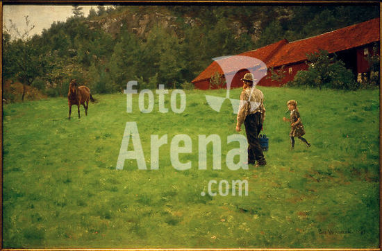 akg3973071 Werenskiold, Erik; 1855-1938. "Das Pferd tränken" (Hesten vannes), 1882. Öl auf Karton, 36 x 54 cm. Inv.Nr. LKM 338. Lillehammer, Kunstmuseum. Museum: Lillehammer, Kunstmuseum.