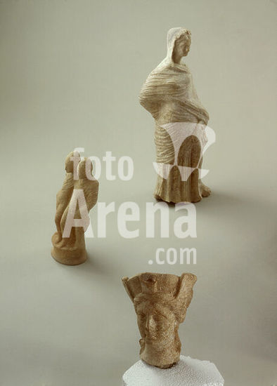 akg4300756 Libanon, hellenistische Zeit. - Drei Kleinplastiken. - Oben: Frauenfigur vom Typus der Tanagra-Figuren. Terrakotta, Höhe 29 cm, Breite 12 cm, Tiefe 7 cm. Mitte: Zwillinge. Terrakotta, Höhe 15 cm, Breite 7,5 cm, Tiefe 5 cm. Unten: Kopf der Tyche. Terrakotta, Höhe 13 cm, Breite 10 cm, Tiefe 7 cm. Fundort: Innenstadt von Beirut. Inv. Nrn. 24905, 25350 und 24904. Beirut, Archäologisches Nationalmuseum. Museum: Berlin, Sammlung Archiv für Kunst und Geschichte. Author: ANONYMOUS.