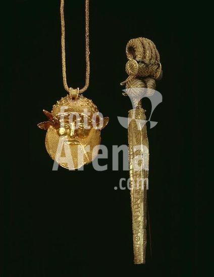 akg456306 Art étrusque, archaïque. Collier avec pendentif (tête d'Achéloos (dieu du fleuve) ) ; v. 600 av. J.-C. Feuille d'or avec granulations, H. du pendentif : 0,04. Provenance : Étrurie. Fibule avec inscription (1re mention du terme "étrusque"), v. 630 av. J.-C. Or, L. 0,216. Département des Antiquités étrusques, grecques et romaines. Paris, Musée du Louvre. Museum: Paris, Musée Du Louvre.