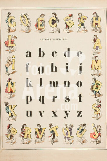 akg4893341 Pädagogik / Lesenlernen / Fibel (ABC-Buch). - "Lettres minuscules". - Das ABC in Kleinbuchstaben. Mit Illustration: Kinder als Träger von Großbuchstaben. Typendruck und Holzstiche, koloriert, anonym, Frankreich, um 1870. Aus einem französischen ABC-Buch. Privatsammlung.