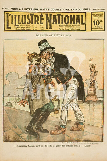 akg5000524 Wilhelm II, German Emperor (1888-1918). Berlin 27. 1. 1859 - House Doorn (Netherlands) 4. 6. 1941. - "Dernier avis et le bon. / - Apprends, Emperor, qi'il est défendu de jetet des ordure dans nos eaux!". (Comprehension, emperor, that it is forbidden to throw waste into our waters). - (Cartoon on Emperor Wilhelm II and the German submarine war in the First World War 1914-1918: Uncle Sam instructs the Emperor). Color print after drawing by Paul Dufresne. Cover to: L'Illustré National, Histoire anecdotique de la guerre européenne, Paris (Jules Tallandier) (1916), no. 107. Private collection.