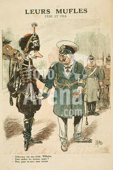 akg5005149 Wilhelm II, German Emperor (1888-1918). Berlin 27. 1. 1859 - Haus Doorn (Netherlands) 4. 6. 1941. - "Leurs mufles" / "Père et fils." / "Prête-moi ton mouchoir, Wilhelm. / - Pour séchere tes larmes, papa? / - Non, pour essuyer mes revers". (Their cads / father and son / lend your handkerchief, William / to dry your tears? / No, to wipe my lapel. - (Caricature of Emperor Wilhelm II and his son, Crown Prince Wilhelm, in the First World War 1914-1918). Colour print after E. Muller. From: L'Illustré National, Histoire anecdotique de la guerre européenne, Paris (Jules Tallandier) (1916), no. 93, backside. Private collection.