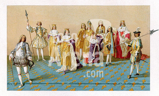 akg5283628 Histoire de France / Ancien Régime / 18e siècle. Les grands dignitaires du sacre de Louis XV, le 25 octobre 1722 en la Cathédrale de Reims. De gauche à droite : le marquis de Dreux, grand-maître des cérémonies ; un des six gardes écossais ; un des six pairs laïques (le duc d'Orléans, le duc de Chartres, le duc de Bourbon, le comte de Charolais, le comte de Clermont, le prince de Conti (représentant le duc de Bourgogne, le duc de Normandie, le duc d'Aquitaine, le comte de Toulouse, le comte de Flandre et le comte de Champagne) ; le maréchal duc de Villars, représentant le connétable et portant l'épée de Charlemagne ; le duc d'Harcourt, capitaine des gardes ; l'archevêque de Reims, un des six pairs ecclésiastiques, tenant le roi par le bras droit et le conduisant au trône ; Louis XV, âgé de 12 ans, revêtu de tous les ornements royaux, ayant la couronne de Charlemagne, tenant le sceptre de la main droite et de la gauche la main de la justice ; le prince Charles de Lorraine, grand écuyer de France, nommé pour porter la queue du manteau royal ; le duc de Villeroy, représentant le capitaine des gardes écossais ; D'Armenonville, garde des sceaux, représentant le Chancelier ; un des cent Suisses de la garde. Chromolithographie, 19e siècle (Collection particulière).
