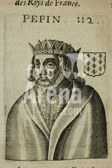 Pepin the Short, Kin of the Franks (751-768); Jupille 714 - Saint-Denis 24. 9. 768. - "PEPIN". - No. 112 from a portrait series of a partly mythical genealogical tree of the kings of France, starting with the biblical forefather Adam and ending with King Louis XIII. Copper engraving, anonymous. From: Thomas Blaise (1578-1654), Histoire généalogique des Roys de France depuis la création du monde jusques à présent, enrichie de leurs portraits (...), Le tout extraicte de l'histoire Universelle de Jacques de Charron, Paris (Thomas Blaise) 1630, p. 223. Private collection.