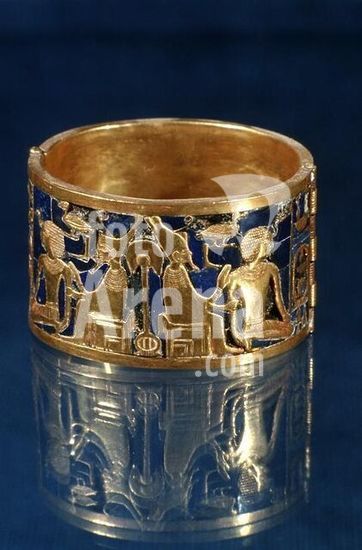 akg599107 Goldener Armreif der K+Ânigin Ahotep (17.Dynastie, verstorben um 1550 v.Chr., Mutter des Pharaos Amosis, +ñgyptisch Ahmose, 18.Dynastie, 1552-1527 v.Chr.) mit Scharnieren und Verschluºstift. Dargestellt ist der Gott Geb, Verk+Ârperung der Erde. Er tr+ñgt die Kronen Ober-und Unter+ñgyptens und sch++tzt den knieenden Herrscher. Kairo, Unteraegypten, Aegypten.