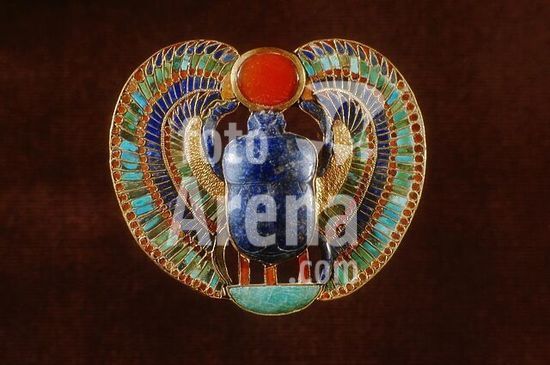 akg600930 Ancient Egypt, 18th dynasty, c.1347 - 1339 BC. Scarab pectoral. Gold with lapis lazuli and cornelian, height: 9 cm. From: Tomb of Tutankhamun, Valley of the Kings, Thebes.