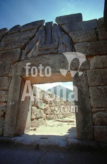 akg601259 Mykene, Akropolis, Löwentor der Befestigungsmauer (um 1250 v. Chr.) mit der Reliefdarstellung einer Säule, flankiert von zwei Löwen. Argolis (Griechenland, Peloponnes). Mykene, Peloponnes, Griechenland.