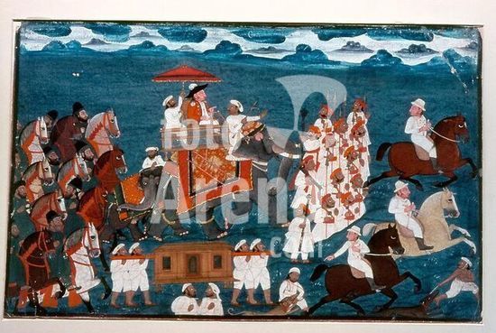 akg609379 An official of the British East India Company riding on an elephant, with an escort of footsoldiers and mounted Indian retainers. Country of Origin: India. Culture: Indian. Date / Period: End of 18th century. Material Size: Painting on paper.