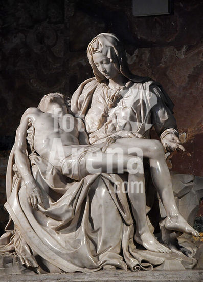akg6107132 The Pieta by Michelangelo Buonarroti (1475-1564) (Michel-Ange)Vatican installed new lighting system for The Pieta, Michelangelo's marble masterpiece in St Peter's basilica, Vatican. October 2018The sculpture has been illuminated using new LED lights with warm white tones. The new lighting system will allow the world to admire the 'full beauty of the faith of Michelangelo'. The Renaissance sculpture, created by a young Michelangelo between 1497 and 1499, depicts the body of Jesus cradled by his mother Mary after the Crucifixion. Carved in Carrara marble, La Pieta can be found in the first chapel to the right of the entrance to St Peter's. It is the only sculpture Michelangelo ever signed. The work was assigned to Michelangelo Buonarroti, who was then 23 years old, for the purposes of decorating the tomb of french Cardinal Jean de Bilheres-Lagraulas. - Carrara Marble- 174 × 195 × 69 cm.