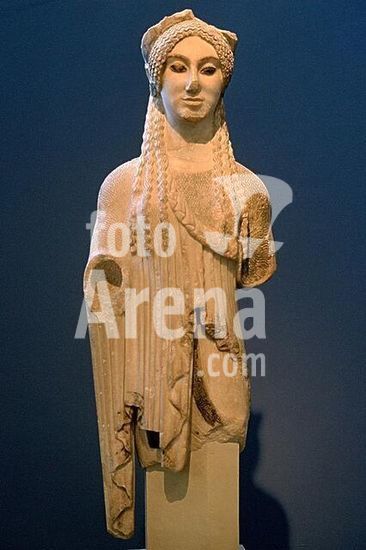akg611373 Greek, Late Archaic, c. 500 BC. Kore from the Akropolis, so-called Kore with almond-shaped eyes. Marble, traces of paint work, height 92 cm. Found at the Acropolis in Athens. Inv. Nr. 674. Athens, Acropolis Museum. Museum: Athens, Acropolis Museum.