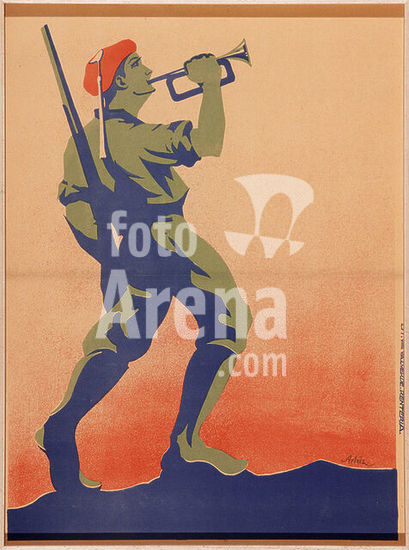 akg7314092 Spanish Civil War 1936-39. - Carlist propaganda poster: Soldier with the red Beret of the Carlist blows into a trumpet. - Colour lithograph, 1936-37, designed by Arlaiz. (Print: Viuda de Valverde, Renteria). 61 × 46 cm. Madrid, Museo Nacional Centro de Arte Reina Sofia.