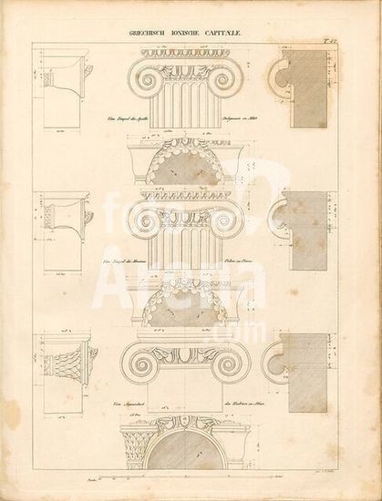 akg7687229 Greek ionic capitals, Ionian capitals, signed: gest. V., K. Kolbe, T. 42, to p. 116, Kolbe, Karl Wilhelm (sc.), Johann Matthäus von Mauch: Neue systematische Darstellung der architektonischen Ordnungen der Griechen, Römer und neuern Baumeister. Dritte Auflage. Potsdam: Verlag von Ferdinand Riegel, 1845.