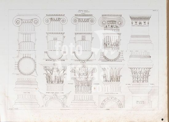 akg7691688 Greek details, bases and Ionic capitals, Ionian bases and capitals, Signed: Gravé par C. Normand, Pl. 69, p. 147, Normand, C. (gravé), Jean-Nicolas-Louis Durand: Recueil et parallèle des édifices de tout genre, anciens et modernes, remarquables par leur beauté, par leur grandeur ou par leur singularité, et dessinés sur une même échelle. Paris: chez l'auteur, 1801.