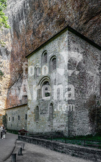 akg7832355 Spanien San Juan de la Pena Aragonien 1962 Felsenkloster Oberkirche 11 Jh Außenansicht von Südwesten.