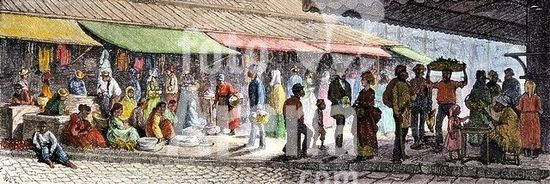 akg915540 Native American and black merchants in a French Quarter market, New Orleans, 1870s. Handcolored woodcut of a 19thcentury illustration.