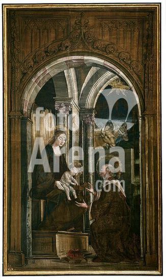 alb2069151 Pedro Berruguete / 'Adoration of the Magi', 1493-1499, Spanish School, Tempera on canvas, 350 cm x 206 cm, P00125. Museum: MUSEO DEL PRADO, MADRID, SPAIN. INFANT JESUS. VIRGIN MARY.