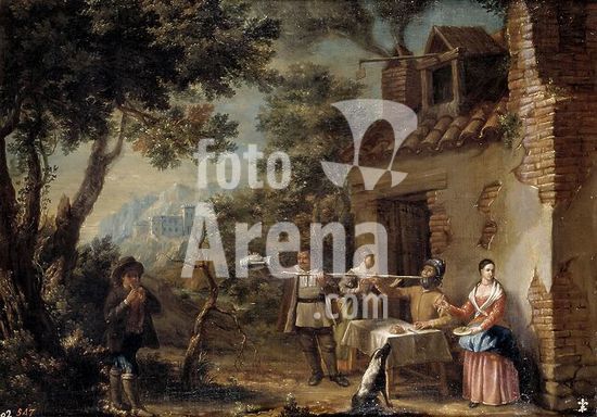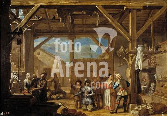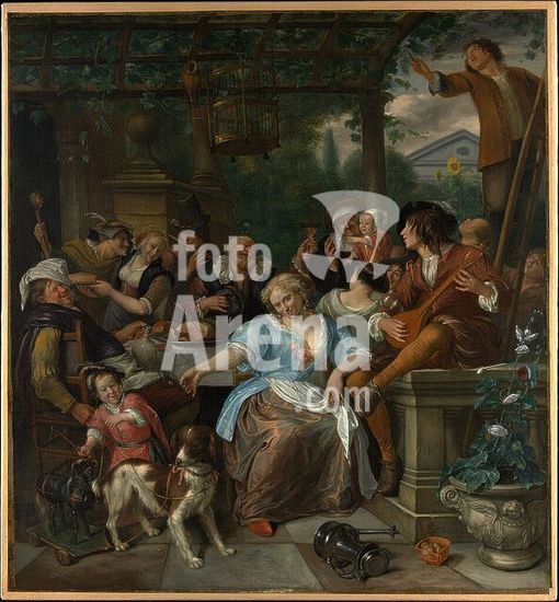 alb3680758 Merry Company on a Terrace. Artist: Jan Steen (Dutch, Leiden 1626-1679 Leiden). Dimensions: 55 1/2 x 51 3/4 in. (141 x 131.4 cm). Date: ca. 1670.In this late painting of about 1673-75, Steen casts himself as the inebriated innkeeper on the left. The artist's second wife, Maria, probably modeled for the provocatively posed hostess (she wears an apron) in the center. Her glass and the fat man's jug are sexually suggestive, but the woman's familiarity with the young musician and the shape of his cittern suggest that he has more to offer her. The overdressed boy serves as a marginal remark about the adults' behavior: a bridled horse and a whip usually stand for Temperance, but not when hitched to a spoiled brat and his indignant dog. The man with a sausage pinned to his hat is Hans Wurst, a fool familiar from the comic stage. Steen wittily blends symbols and themes (for example, child-rearing and the Garden of Love) into an original creation, quite as the picture's style seems to blend oil and water by mixing the manners of Gerard ter Borch and Jacob Jordaens. Museum: Metropolitan Museum of Art, New York, USA. Author: Jan Steen.