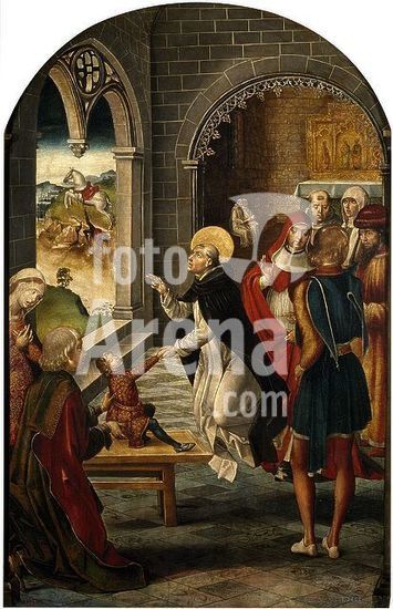 alb2069898 Pedro Berruguete / 'Saint Dominic Resurrects a Boy', 1493-1499, Spanish School, Oil on panel, 122 cm x 83 cm, P00610. Museum: MUSEO DEL PRADO, MADRID, SPAIN.