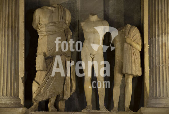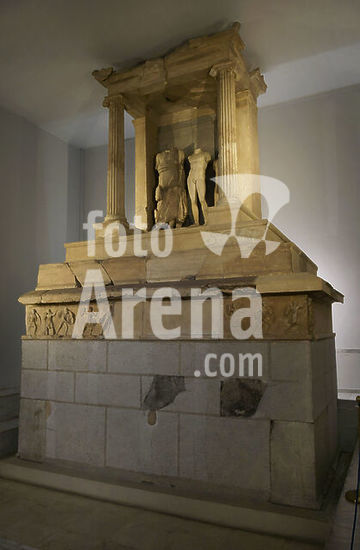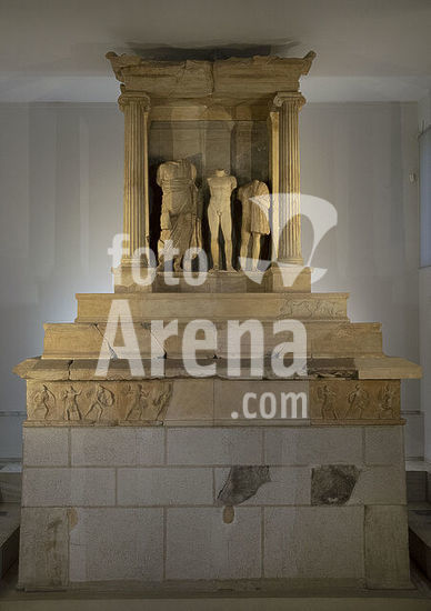 alb21097432 Grave monument of Nikeratos and his son Polyxenos, metics from Istros on the Black Sea coast. Composed by a limestone podium, which supports a marble pedestal with steps. The base features a frieze depicting an Amazonomachy, on which stands a funerary naiskos in Ionic order with three statues inside. The three belong to one family. The one on the far left represents Nikeratos, wearing a himation. The central one is of his son, Polyxenos, depicted as a naked athlete in the contrapposto pose. The statue on the right represents one of the family's slave boys. Found in Kallithea. Ca. 330 BC. General view. Archaeological Museum of Piraeus. Greece.