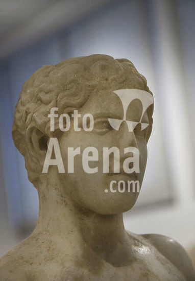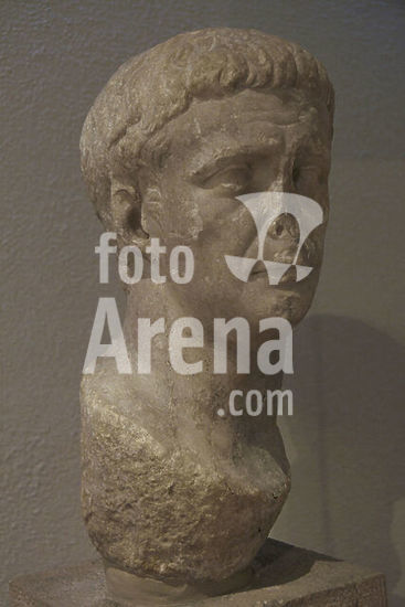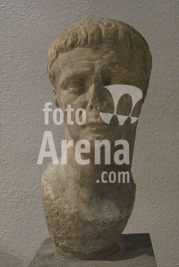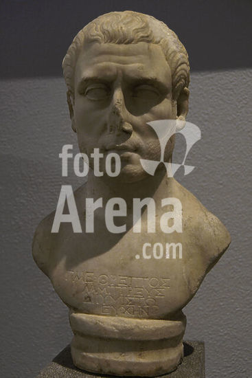 alb21097434 Bust of the 2nd century AD Athenian Gaius Memmius, son of Threptus, from the municipality of Lambtrai in Attica, Greece. Dedicated by him to Zeus Hypsistos (Highest Zeus). Archaeological Museum of Piraeus. Greece.