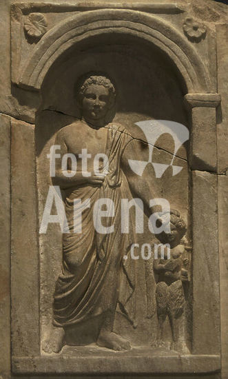 alb21097493 Grave monument of Nikeratos and his son Polyxenos, metics from Istros on the Black Sea coast. Detail of the funerary naiskos in Ionic order with three statues inside. The three belong to one family. The one on the far left represents Nikeratos, wearing a himation. The central one is of his son, Polyxenos, depicted as a naked athlete in the contrapposto pose. The statue on the right represents one of the family's slave boys. Found in Kallithea. Ca. 330 BC. General view. Archaeological Museum of Piraeus. Greece.