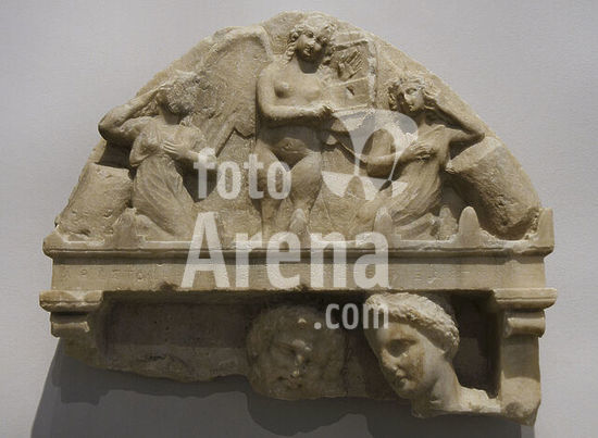 alb21097440 Ancient Greece. Crowning of the funerary stele of Proxenides, from the deme of Steiria (Attica, Greece), his wife Aristodike, and Menippe. Two professional female mourners frame the siren playing the kythara. Below, a male and a female head. From Piraeus, 350-330 BC. Archaeological Museum of Piraeus. Greece.