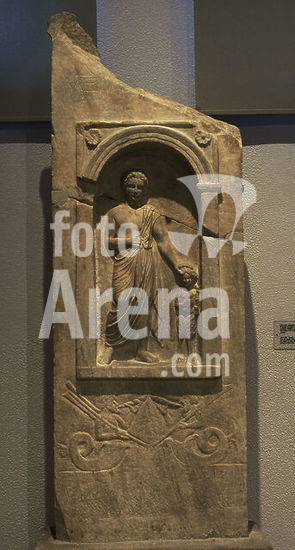 alb21097436 Ilissos-type funerary stele of a young man. The deceased rests his head on his raised hand. From the north cemetery of Piraeus on Thivon Street, c. 330 BC. Archaeological Museum of Piraeus. Greece.