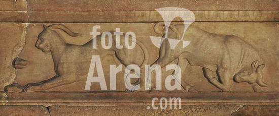 alb21097444 Detail of the mid-level frieze of the naiskos from the grave monument of Nickeratos and his son Polyxenos. Depiction of bulls, lions and monsters. Found in Kallithea. Ca. 330 BC. Archaeological Museum of Piraeus. Greece.