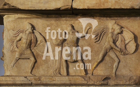 alb21097450 Depiction of an Amazonomachy. Detail of the frieze from the grave monument of Nikeratos and his son Polyxenos. Found in Kallithea. Ca. 330 BC. Archaeological Museum of Piraeus. Greece.