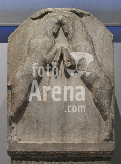 alb21097458 Upper part on an Attic funerary stele. Representation of two heraldic he-goats rising on their hind legs. Second half of the 4th century BC. Archaeological Museum of Piraeus. Greece.