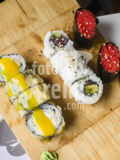 alb22608418 A variety of sushi, including uramaki and gunkan maki, served on a wooden board, Mallorca, Balearic Islands, Spain.