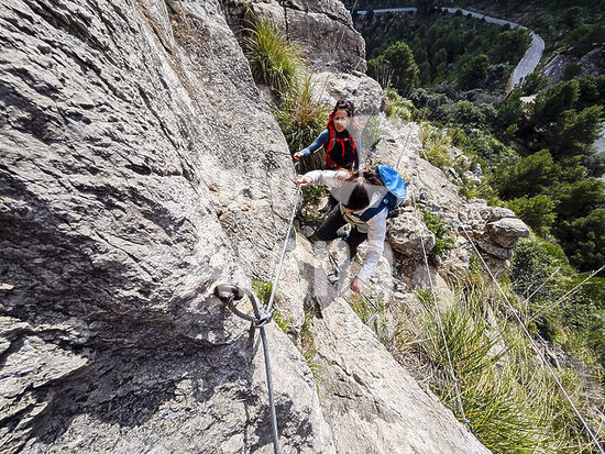 alb22609617 Hiker ascending a pass equipped with pegs to Can Palou tower (sa Mola de Tuent tower), Escorca, Natural area of the Serra de Tramuntana., Majorca, Balearic Islands, Spain.