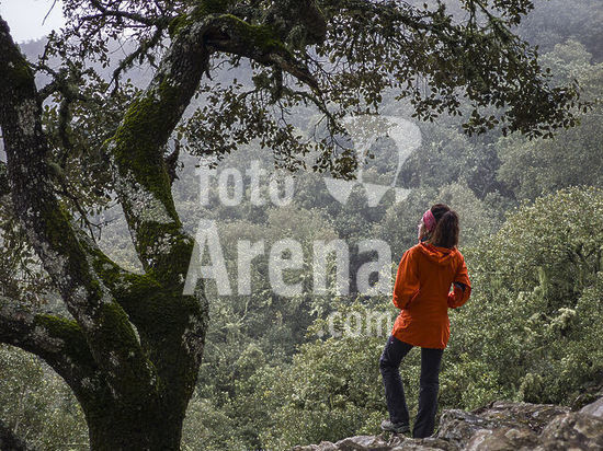 alb22608455 Hiker through the fog advancing along a wooded path, Mola de Planicia, Banyalbufar, Natural area of the Serra de Tramuntana., Majorca, Balearic Islands, Spain.