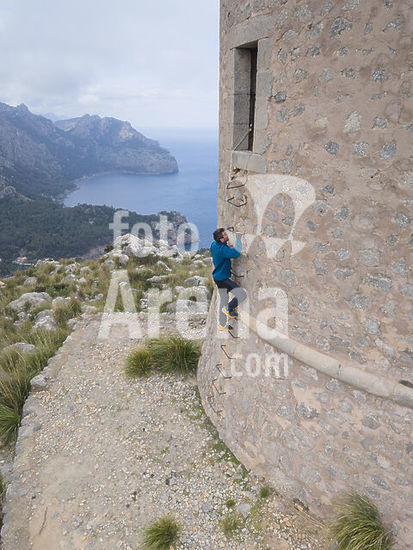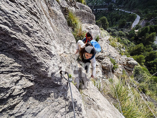 alb22608419 Hiker ascending a pass equipped with pegs to Can Palou tower (sa Mola de Tuent tower), Escorca, Natural area of the Serra de Tramuntana., Majorca, Balearic Islands, Spain.