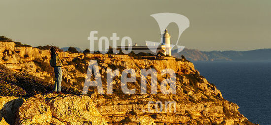 alb22609174 woman on Cliffs of El Cap Blanc and views of the Cabrera National Park, municipality of Llucmajor, Mallorca, Balearic Islands, Spain.