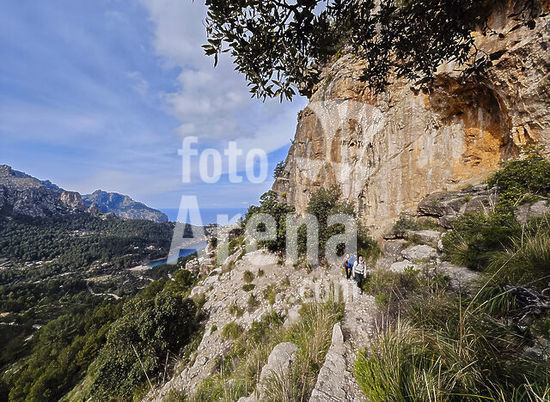 alb22608631 Hikers ascending Puig de Planici via the Son Sanutges pass, Esporles-Banyalbufar, Natural area of the Serra de Tramuntana., Majorca, Balearic Islands, Spain.