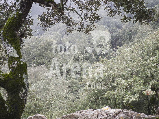 alb22609612 holm oak grove in the mist, plateau of Planicia, Banyalbufar, Natural area of the Serra de Tramuntana., Majorca, Balearic Islands, Spain.