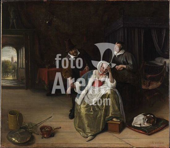 alb3604436 The Lovesick Maiden. Artist: Jan Steen (Dutch, Leiden 1626-1679 Leiden). Dimensions: 34 x 39 in. (86.4 x 99.1 cm). Date: ca. 1660.Doctors were familiar targets of parody in Steen's native Leiden, the home of a famous medical school. Borrowing from the comic stage, Steen identifies the old man as a quack by his peculiar clothing, while the nature of the young lady's malady is suggested by the Cupid over the door, and other intimations like the open bed. The picture dates about 1660. Museum: Metropolitan Museum of Art, New York, USA.