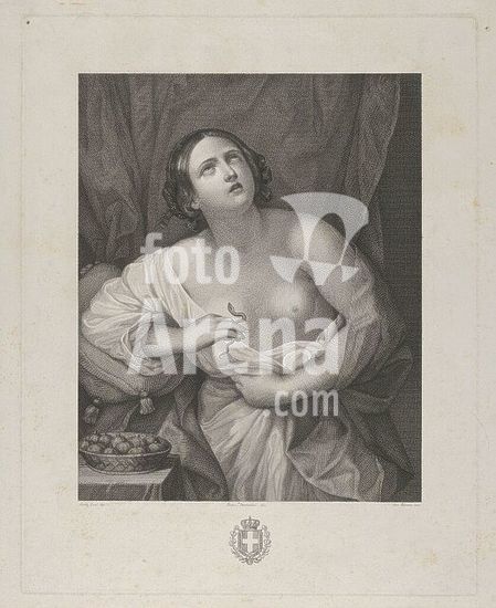 alb3608349 Cleopatra looking upwards while holding an asp in her right hand and clutching at her stomach with her left, a bowl of figs at left, after Reni. Artist: After Guido Reni (Italian, Bologna 1575-1642 Bologna); Engraved by Giovanni Rivera (Italian, Genoa ca. 1776-1861 Genoa); Intermediary draughtsman Francesco Pieraccini (active Florence, 1800-50). Dimensions: Sheet: 14 13/16 in. × 12 in. (37.7 × 30.5 cm)Plate: 13 3/4 × 10 13/16 in. (35 × 27.5 cm). Date: ca. 1796-1861.After a painting by Reni. Museum: Metropolitan Museum of Art, New York, USA.